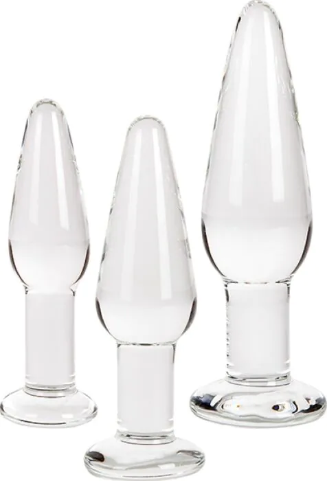 Een set van drie transparante glazen anal plugs in oplopende maten, bedoeld voor wie rustig wil opbouwen. Glas is stijver dan silicone, ideaal voor precieze plaatsing en temperatuurspelen. De vlakke basis geeft goed houvast bij in- en uitbrengen. Geschikt voor beginners die stap voor stap willen wennen aan anale penetratie.
