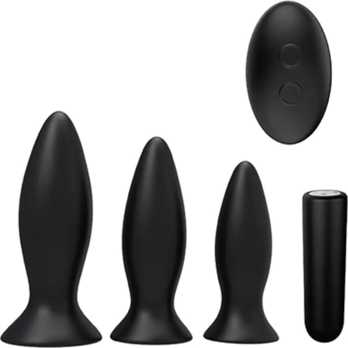 Drie anale plugs in verschillende maten voor geleidelijke stimulatie. Inclusief een controleerbare vibrerende bullet voor extra plezier.