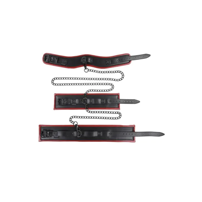 Als je even rustig binnenkomt in de winkel en vraagt wat je nodig hebt voor stevige, gecontroleerde bondage: dit is een set met halsband, polsboeien en enkelbanden die alle drie gevoerd zijn en verstelbaar. De metalen ketting van 182,8 cm maakt het eenvoudig om handen en voeten te verbinden en het lichaam grotendeels onbeweeglijk te maken — dat geeft veel mogelijkheden voor strakke, dominante scènes.