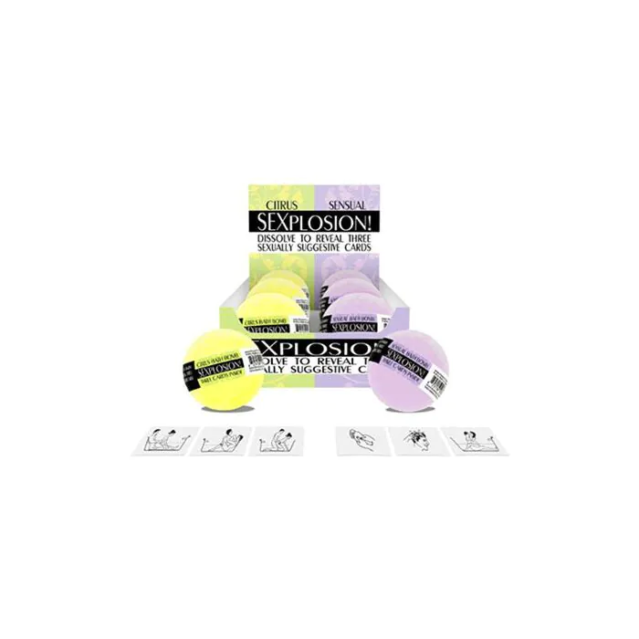 SEXPLOSION! badbommen zijn harde bruisballen in twee geuren (lavendel en exotisch) die in bad bruisen en een ondeugend kaartje onthullen. Geschikt voor wie op zoek is naar een speels, erotisch badmoment of cadeau voor koppels. Niet bedoeld voor zeer gevoelige huiden; controleer ingrediënten en doe een test als je gevoelig bent.