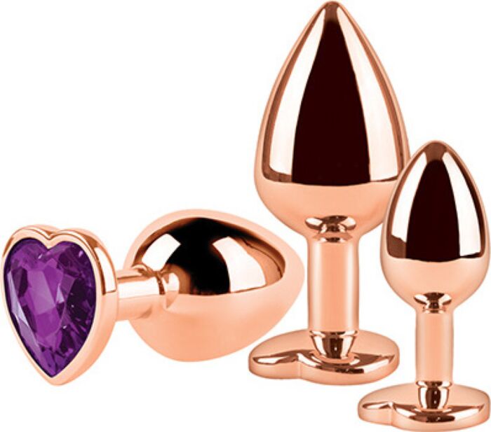 Een set van drie glanzende metalen anal plugs met identiek design in oplopende maten. Fijn voor wie stap voor stap wil wennen aan anale penetratie: stevige, gladde plugs met een platte basis en een sierlijk hart als greep. Met metaal kun je spelen met temperatuur en ze zijn makkelijk schoon te maken — passend voor beginners die stevigheid waarderen.