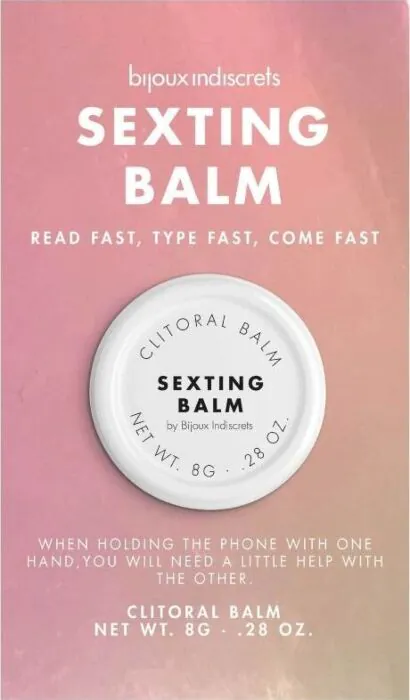 Klein, discreet balsempje speciaal voor de clitoris: BIJOUX SEXTING BALM geeft binnen enkele seconden een warm gevoel. Handig formaat van 8 g om mee te nemen; gebruik je één hand voor je telefoon, dan is dit een snelle hulp voor de andere. Voor wie wil versterken zonder gedoe en zonder apparaat.