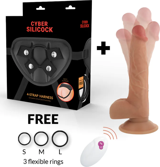 Compleet strap-on pakket met realistische 'Cyber Silicone Skin' dildo, afstandsbediening en verstelbaar vinylharnas. Geschikt voor wie wil beginnen met harnasspel of wil upgraden naar een realistisch aanvoelend, oplaadbaar speeltje met meerdere vibratie- en rotatiepatronen. Wordt geleverd met drie siliconen ringen zodat je verschillende dildo‑diktes kunt gebruiken.