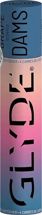 SHEER GLYDE Dams zijn dunne, zijdezachte latexvellen van 25×15 cm met een lichte druivengeur, per verpakking van 4. Handig om bij je te hebben voor veilige orale seks (cunnilingus of rimming) en ook inzetbaar bij vaginale of anale contacten. Geschikt als draagbare barrière voor wie bescherming wil zonder bulk; let op bij latexallergie.