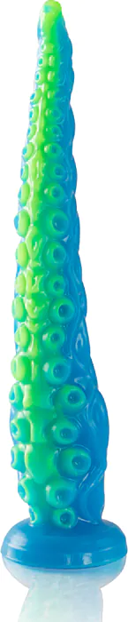Dit is de Scylla: een grote silicone dildo met een tentakelachtige vorm en fluorescerende look. In de winkel leg ik 'm zo uit: de punt is slank voor gerichte stimulatie, daarna bouwt hij geleidelijk op naar meer volheid en een duidelijk bredere zone voor wie stevigere sensaties zoekt. De brede basis geeft houvast en voorkomt dat hij te ver naar binnen kan.