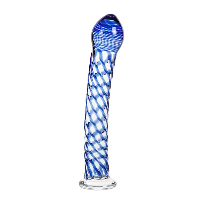 Dit is een glasdildo (transparant met blauwe details) die zich onderscheidt door zijn stevige, gladde oppervlakte en de mogelijkheid om met temperatuur te spelen — dat geeft extra variatie zonder elektronica. De semi-gebogen as helpt gericht te masseren (g-spot of prostaat), terwijl de conische punt het inbrengen vergemakkelijkt en de spiraalreliëfs subtiele textuur toevoegen zonder te ruw te zijn. De insertabele lengte is 180 mm: een ruime lengte die voor veel gebruikers voldoende is zonder extreem lang te zijn. De vlakke basis biedt een betrouwbaar houvast en past op armbanden met een kleine anilla voor handsfree opties.