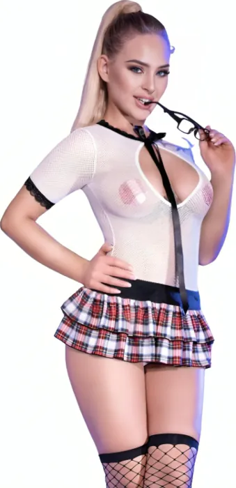 Het kostuum omvat een bodysuit, een korte geplooide rok, een paar kousen, een brillenaccessoire en bedekkingen voor de tepels, waardoor je een complete look hebt.