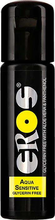Aqua Sensitive van Eros is een waterbasis glijmiddel zonder glycerine, verrijkt met aloë en panthenol. Het voelt zacht aan, plakt minder dan veel standaard waterglijmiddelen en is pH-geoptimaliseerd voor de huid. Handig flesje van 100 ml voor wie gevoelig is of gewoon een neutrale, geur- en smaakloze optie zoekt bij condoom- en seksspeelgebruikt.