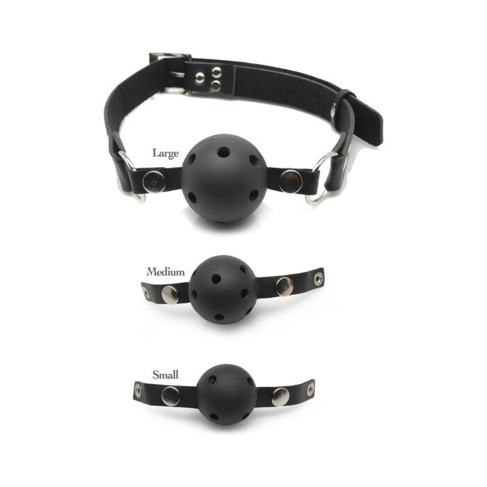 Cada bola es intercambiable con los broches de presión, fabricada de plástico no tóxico y equipado con agujeros para facilitar la respiración. La correa resistente de cuero negro se ajusta fácilmente para adaptarse a la mayoría de los tamaños.