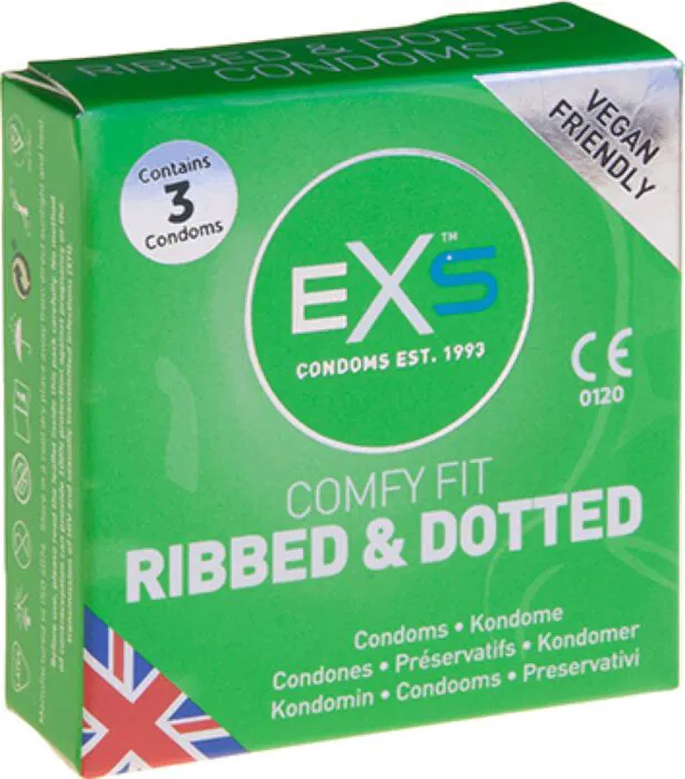 De Ribbed & Dotted van Exs komen in een verpakking van 3 stuks, ideaal voor een paar avonden plezier.