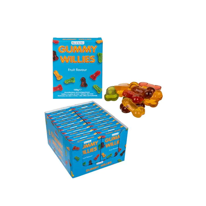 Gominolas de diferentes sabores y en una divertida forma de mini pene, con glánde y testículos marcados. Viene en cinco colores diferentes (marrón, verde, rojo, naranja y amarillo). Incluye aproximadamente unos 100 g en gominolas en un cómodo paquete. Se vende por unidad. Características principales:Gominolas en forma de pene.5 colores diferentes y sabores diferentes.Vienen en un paquete que contiene unos 100 g.