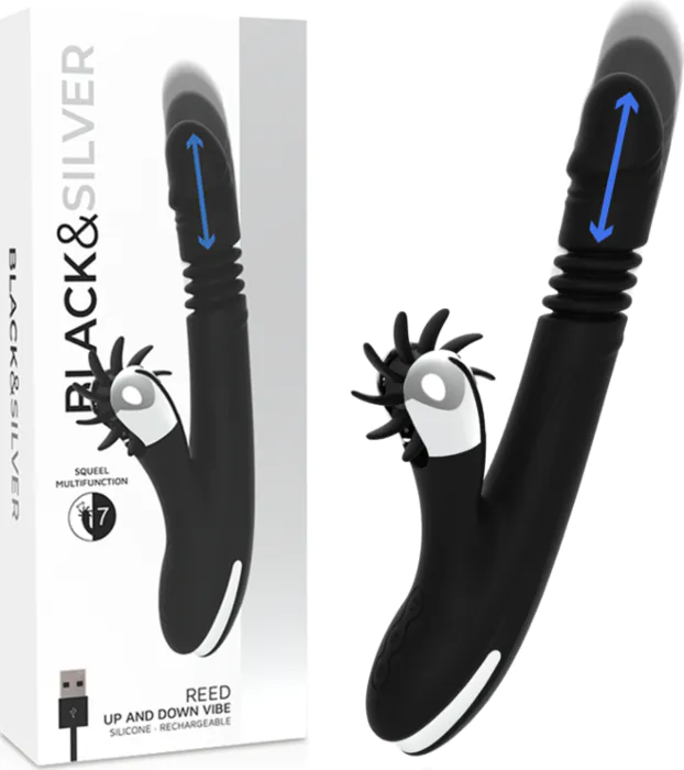 De BUNNY REED van BLACK&SILVER is een G-spot vibrator met een op-en-neer mechaniek en aparte clitorisstimulator. Voor wie wil variëren: 7 up & down-standen, 7 vibratiestanden en 7 clitorispatronen. Hij is gemaakt van superzachte siliconen, oplaadbaar via USB en waterdicht. Wordt geleverd met een klein water-based glijmiddel; let op: verkoop alleen in fysieke winkels.