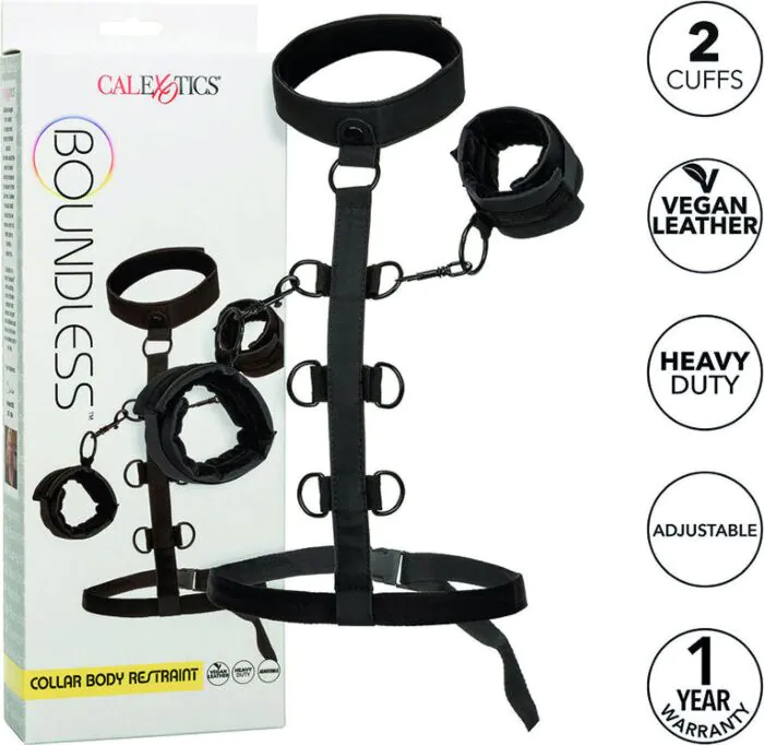 Verbeter je bondage-ervaring met de CalExotics Boundless Halsband. Dit systeem biedt veelzijdigheid met aanpasbare handboeien en een luxe uitstraling.