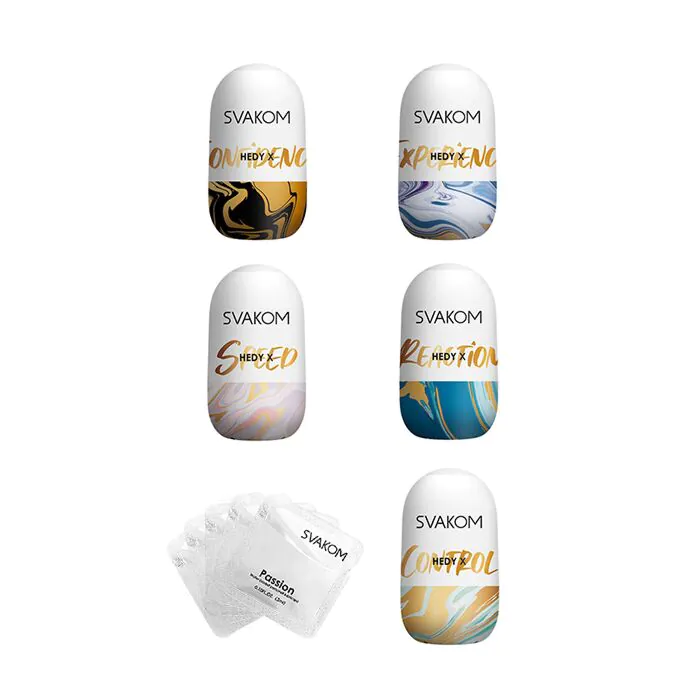 Hedy X es un pack de 5 huevitos masturbadores pensados para la estimulación del pene. Singular selección de cada uno de los huevitos masturbadores HEDY X de SVAKOM. Entre ellos encontramos un Confidence, un Control, un Experience, un Reaction y un Speed. Son muy flexibles y se adaptan muy bien a todo tipo de penes, de un material suave y agradable de TPE/PP. En su interior encontramos texturas que sobresale con formas irregulares que aportan grandes sensaciones. Con un diseño reversible útil por los dos lados del masturbador, para ampliar las opciones de sensaciones. Muy discreto, de tamaño mini, divertido y muy práctico. Debe usarse con un lubricante a base de agua para crear un movimiento más fluido y mejorar la experiencia. Son reutilizables hasta un total aproximado de 5 a 10 veces. Es muy fácil de limpiar y totalmente sumergible. Contiene 5 monodosis de lubricante a base de agua, una por cada huevo.Características principales: Pack de 5 huevos mini masturbadores para el pene. Mix de huevos HEDY X.Formato huevo.Muy flexibles y adaptables a todo tipo de tamaños.Material TPE/PP.Texturizado y reversible. Discreto y práctico.Debe usarse con lubricante a base de agua. Reutilizables hasta unas 5 o 10 veces.Fácil de limpiar. Sumergible.Incluye 5 monodosis de lubricante a base acuosa, una por masturbador.
