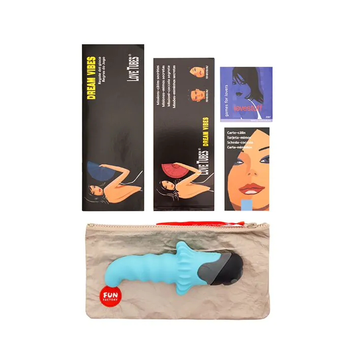 ¿El plan de todas las noches con tu pareja es mirar la televisión hasta las tantas? Descubre lo bueno que es disfrutar del placer entre vosotros y atrévete a jugar con Dream Vibes, en él encontraras un vibrador fantástico, Stubby sumergible de Fun Factory, además de diferentes pruebas y misiones secretas para superar tanto para él como para ella. Este juego os aportará a ti y a tu pareja un placer erótico puro, además de tener la oportunidad de conoceros mutuamente en esta nueva faceta tan sensual. ¿Quién ha dicho que jugar es cosa de niños? Además del divertido vibrador y el cuaderno con 14 misiones secretas, el juego incluye un gel lubricante y 4 tarjetas-mimos. ¿Preparados para resolver la misión secreta?El juego incluye: un vibrador Stubby sumergible de Fun Factory, una bolsita para guardar el vibrador, también de fun factory, un cuaderno con 14 misiones, 4 tarjetas-mimos, un cuaderno con las reglas del juego, gel lubricante. Idiomas: francés, español, Italiano y portugués