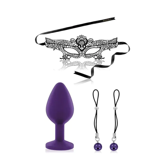 Een compact bondagesetje van Rianne S met blinddoek, plug en tepelhangers — bedoeld om voorzichtig te experimenteren met zintuiglijke spelletjes en lichte bondage. Geschikt voor koppels of beginners die sfeer en speelsheid willen toevoegen zonder ingewikkelde gear. Kies dit setje als je zoekt naar een nette, toegankelijke introductie in bondage.