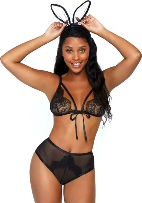 | Set | 3-delige set: kanten bh met bandjes, rugloze slip met open achterkant en pluizig staartje, haarband met oren |