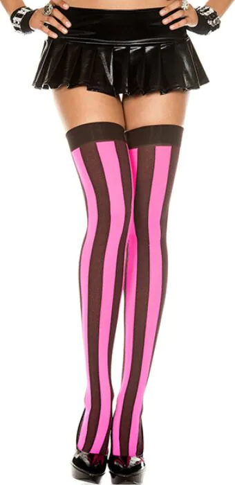 Als je in de winkel voor deze kousen staat, zou ik zeggen: dit zijn stijlvolle medias met verticale strepen in een zwart/roze combinatie die meteen aandacht naar je benen trekt. Verticale strepen geven visueel lengte aan je benen en zorgen voor een speelse, flirtende look zonder dat het luid wordt.