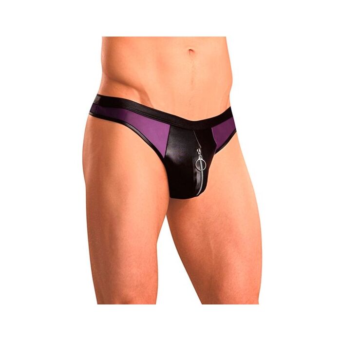 Tanga de color lila y negro con cremallera. La cintura es ancha y elástica para acomodarse a tu cuerpo.