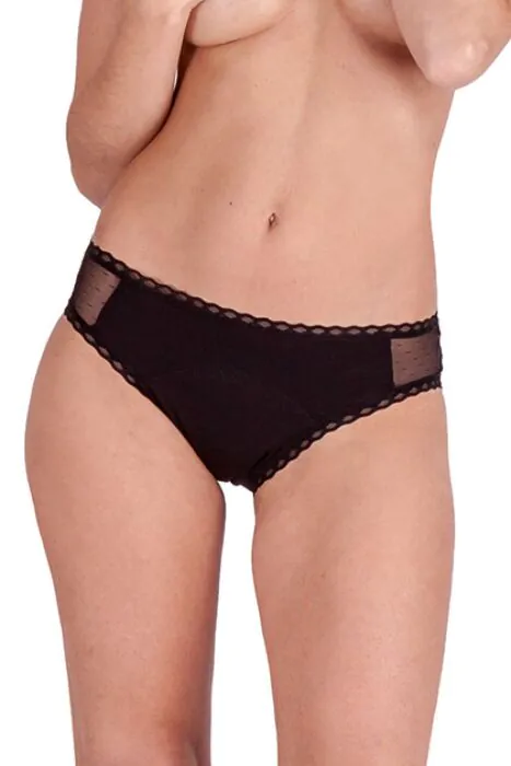 Dit is een dagelijks gedragen menstruatieslip met een geïntegreerde verstevigde zone van de intieme zone tot de lenden — dat voel je meteen: extra zekerheid zonder gedoe met inlegkruisjes. De slip is gemaakt van rekbare materialen met kanten details voor een klassieke look, maar bedoeld voor dagelijks comfort. Door de absorberende laag (20 ml) is hij gericht op lichte tot normale bloedingen en lekkages; de fabrikant vermeldt ook gebruik overdag en als aanvullende bescherming naast een cup.