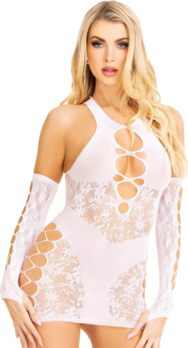 Dit sexy minivestido van Leg Avenue laat je stralen met zijn aantrekkelijke kant en gedetailleerde neppanty. Het elastische en ademende materiaal zorgt voor een comfortabele pasvorm, waardoor je je zelfverzekerd voelt tijdens een spannende avond. De set bevat naast het minivestido ook bijpassende guantes voor een complete look.