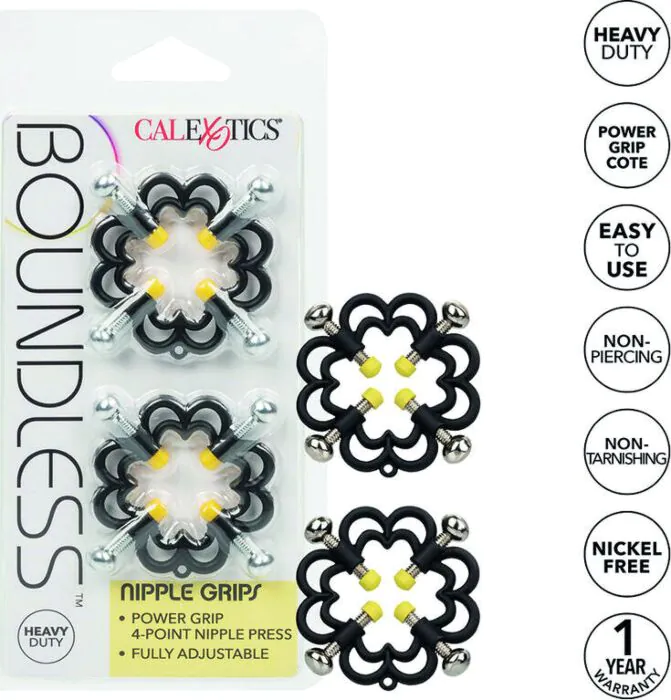 ¡Verken nieuwe genotsgebieden met de Boundless tepelklemmen! Met een 4-punts klemontwerp voor nauwkeurige druk, verstelbaar en veelzijdig om jouw perfecte punt te vinden, en punten met stevige gripcoating voor intense emoties. Durf je ze op andere erogene zones te proberen? Gemakkelijk te gebruiken, zowel voor beginners als experts. Voeg wat pit toe aan je intieme ontmoetingen met de Boundless klemmen. Ervaar het genot in zijn volle glorie!