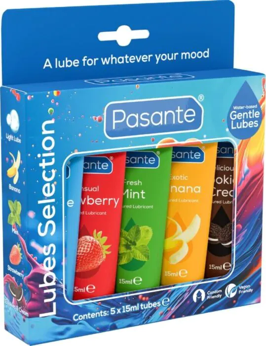 Klein pack met vijf mini waterbasis glijmiddelen van PASANTE (5 x 15 ml) in verschillende smaken. Handig voor testen, reizen of een avondje uit; veilig te gebruiken met condooms en alle seksspeeltjes. Voor wie variatie zoekt zonder rommel: vegan, geurloos en parabenenvrij. Niet geschikt voor wie allergisch is voor glycerine of geurstoffen.