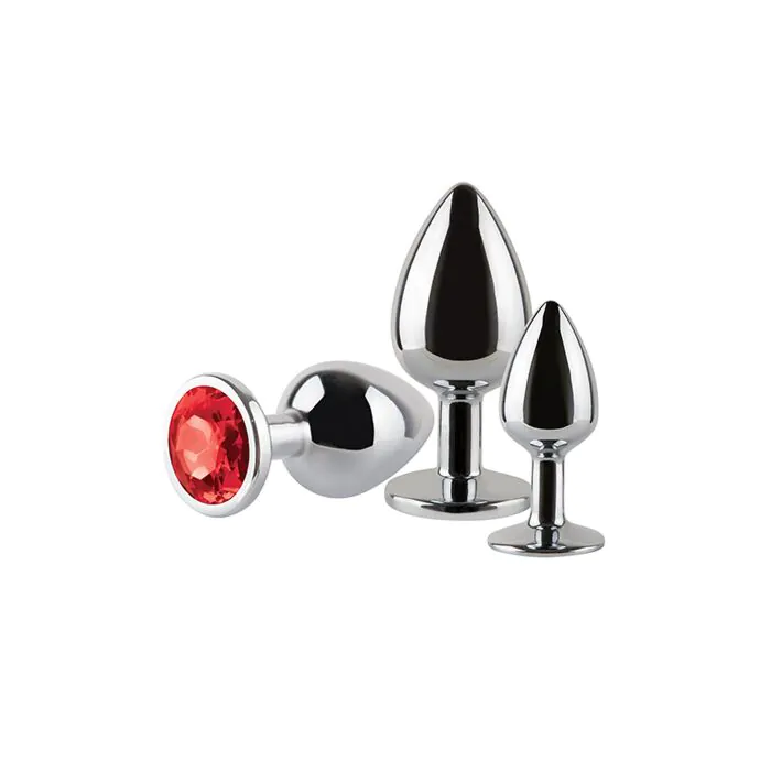 Set van drie glanzende metalen anaaltops in oplopende maten, ontworpen voor wie geleidelijk wil wennen aan anale penetratie. Stevig en glad materiaal geeft een precieze grip aan de brede basis met siersteen; geschikt voor beginners die controle en temperatuurvariatie willen. Een betaalbare keuze in intiem speelgoed als je iets stijf en makkelijk schoon te houden zoekt.