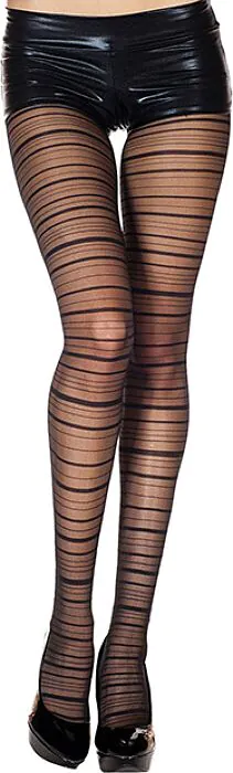 Een zwarte panty van Music Legs met horizontale strepen die een speelse, suggestieve uitstraling geeft zonder te overdrijven. Geschikt voor wie op zoek is naar een extra detail onder kleding of als aanvulling op je lingerieset. Eenvoudig te combineren en makkelijk te dragen voor wie houdt van een verfijnde, gestreepte look.