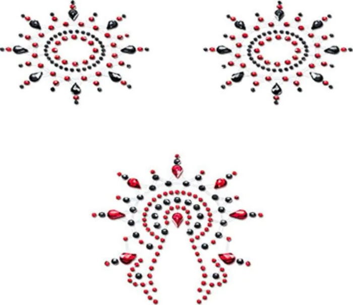 Glitterende lichaamsjuwelen voor borst en pubis, uitgevoerd met meer dan 300 kristallen. Deze 3-delige set plak je snel op met de bijgeleverde adhesives of hergebruik je met huidvriendelijke lichaamslijm. Comfortabel genoeg om onder lingerie te dragen maar ook geschikt om zichtbaar te showen tijdens een optreden of feestje. Voor wie wil stralen zonder gedoe.