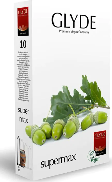 Glyde Ultra Supermax zijn 100% veganistische, extra grote preservatieven van natuurlijk latex. Ze bieden comfort en veiligheid zonder compromissen.