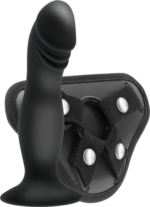 Dit is een strap-on set waarbij het harnas en de dildo samen worden geleverd. De dildo is van silicone en heeft een krachtige zuignap, waardoor je hem los van het harnas kunt gebruiken op een glad oppervlak. Het nylonharnas heeft verstelbare, vierwegsbanden en twee ringen zodat je van maat kan wisselen of andere dildos met verschillende bases kunt inzetten. Binnenin zit een klein, wegwerkbaar vak om een mini vibrator in te schuiven voor extra clitorale stimulatie.