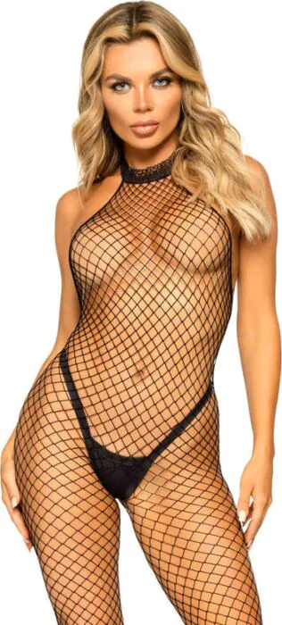 Versterk je vrouwelijkheid met deze sexy bodystocking van Leg Avenue. Het industriële net met halternek biedt een verleidelijke en elegante look, great voor speciale gelegenheden.