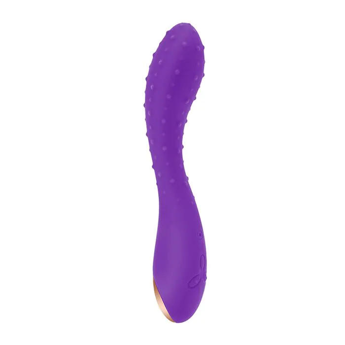 Als je in de winkel zou staan zou ik het zo uitleggen: dit is een slanke, gebogen vibrator die speciaal is vormgegeven om het G‑punt gericht te stimuleren. De shaft voelt aan de buitenkant zacht door de siliconenafwerking, maar de constructie zelf is vrij stijf — dat maakt hem geschikt wanneer je precieze druk en contact wilt. De rij kleine puntjes op het oppervlak geeft extra textuur tijdens inbrengen en beweging.